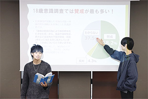 部員による講義形式の発表や意見交換などをメインの活動とし、年に数回、裁判所見学なども行っています。公務員試験や資格取得など、個々で目標を持ち、当研究部はその実現をバックアップ。そのため、法律関係の参考書はもちろん、簿記やFP、就職関係の参考書を多数集めており、資格取得や就職に役に立てられます。勉強のサポートも行っていますので、興味がある人はぜひ見学に来てください!