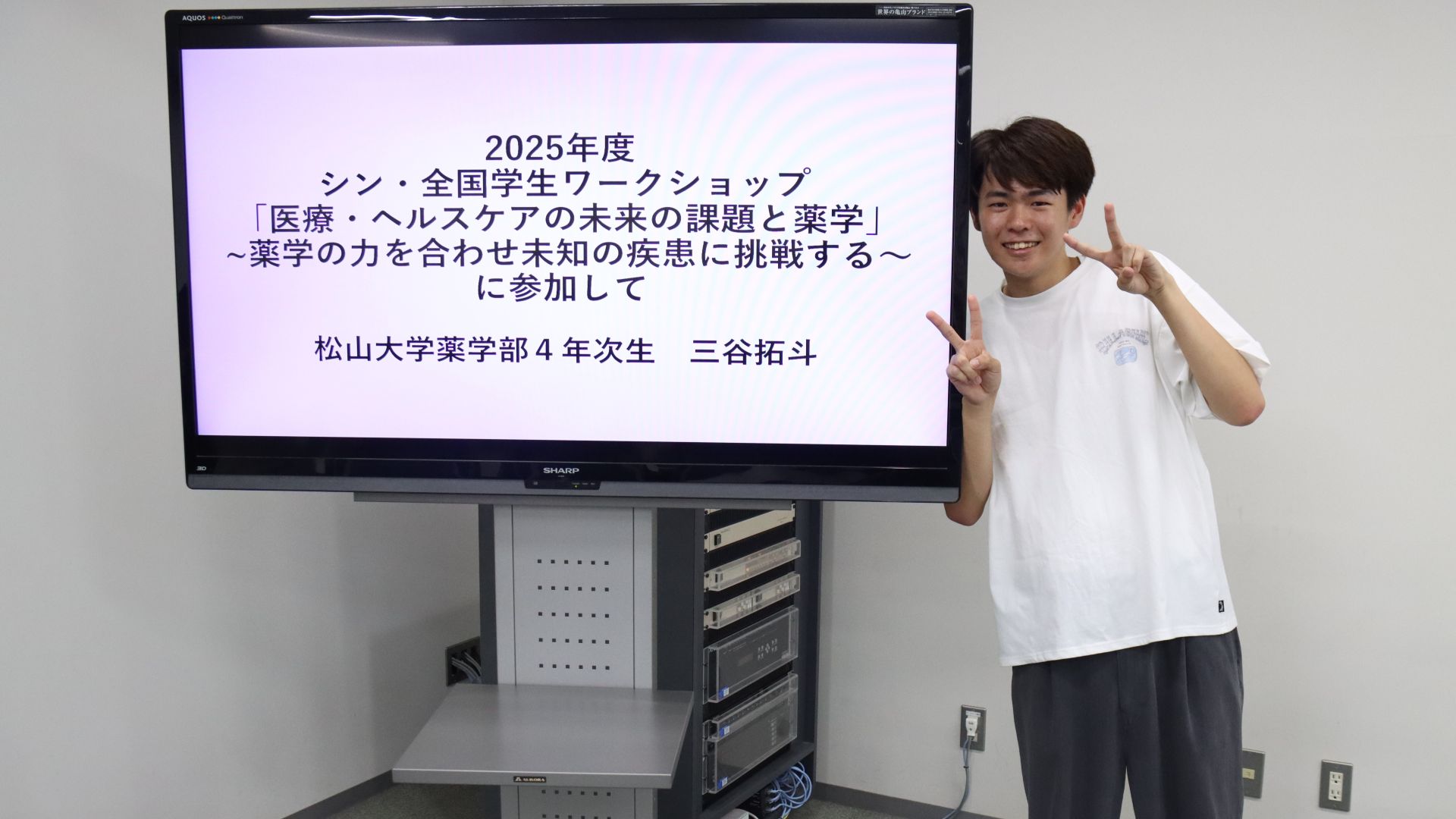 このワークショップは、三谷さんにとって「自分と同じ立場の仲間が増えた」ことに加え、「さまざまな価値観や視野を共有できた」という点で非常に貴重な経験となった。参加後は、松山大学薬学部の学生を対象に、報告会を実施した。「後輩にもぜひ挑戦してほしい」と三谷さんは力強く次世代への期待を語っている。この経験は、将来、幅広い医療課題に対応できる人材へと成長するための大きな糧となったに違いない。
