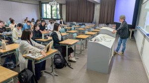 7月28日(月曜日)の活動では、道後商店街振組合の理事長さんに大学へ来ていただき、これまでの成果とアイデアのプレゼンを行いました。まずアイデアをおおまかに決めて、その後どのように販売していくかを決めていきました。世の中の売れるものは確率論と教えていただき、学生の間で意見を言い合いながら、また理事長さんからもアドバイスをいただき市場価値があるものはなにかと考え、細かく商品を絞り込むことができました。商品を決めたことがゴールではなくスタートなので、現在やらなくてはならないことを改めて見つめなおし、各班で話し合い、話し合ったまとめを全体でも共有しながらプロジェクトを進めていきます。