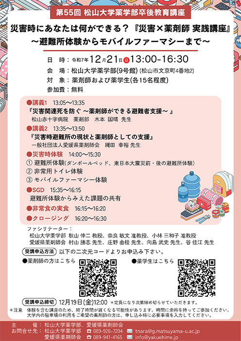 2025年12月21日(日曜日)に薬学部では、一般社団法人 愛媛県薬剤師会と共催の形で、薬剤師および薬学生を対象とした被災者支援の体験講座を開催します。