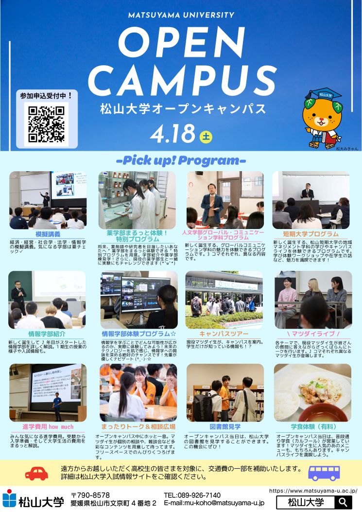今回のオープンキャンパスでは、誕生して2年目を迎えた「情報学部」や、新設の「人文学部グローバル・コミュニケーション学科」「松山短期大学 地域マネジメント学科」など、マツダイの最新の学びを丸ごと体験できるプログラムをご用意しました。