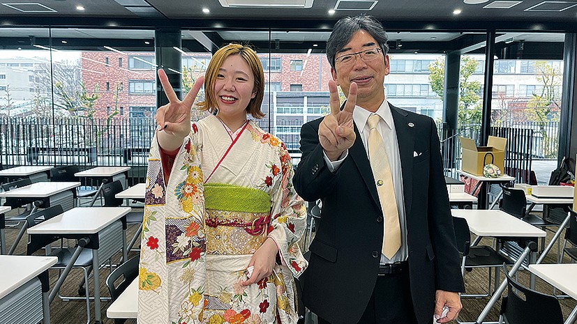 もともと英語が好きで、英語はもちろん、いろんな語学について深く学びたいと、松山大学に進学した泉本さん。言語学を専攻し、TOEICの勉強に注力するかたわら、コーヒースタンドでのアルバイトにも励む日々を過ごした。将来はキャビンアテンダント(CA)を目指し、在学中にエアラインスクールにも通って熱心に学んでいたが、3年次に上がるタイミングで新型コロナウイルス感染症が拡大。20歳となり、学びも遊びもいっそう充実した学生生活を送るはずだったが、オンライン授業となって構内に入れず、楽しみにしていたゼミ旅行も中止になってしまう。「突然訪れた想像もつかなかった災厄でしたが、そんな逆境にあっても、仲間たちと『なんとか踏ん張ろう!』と励まし合って頑張りました。学部は関係なく、学生の距離が近い松大ならではの雰囲気もプラスに働いたと思います」。