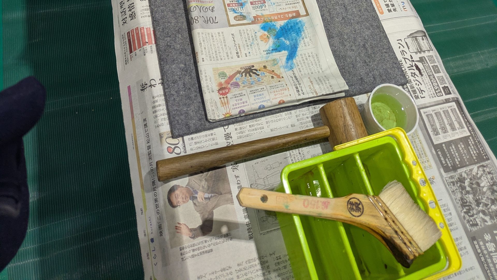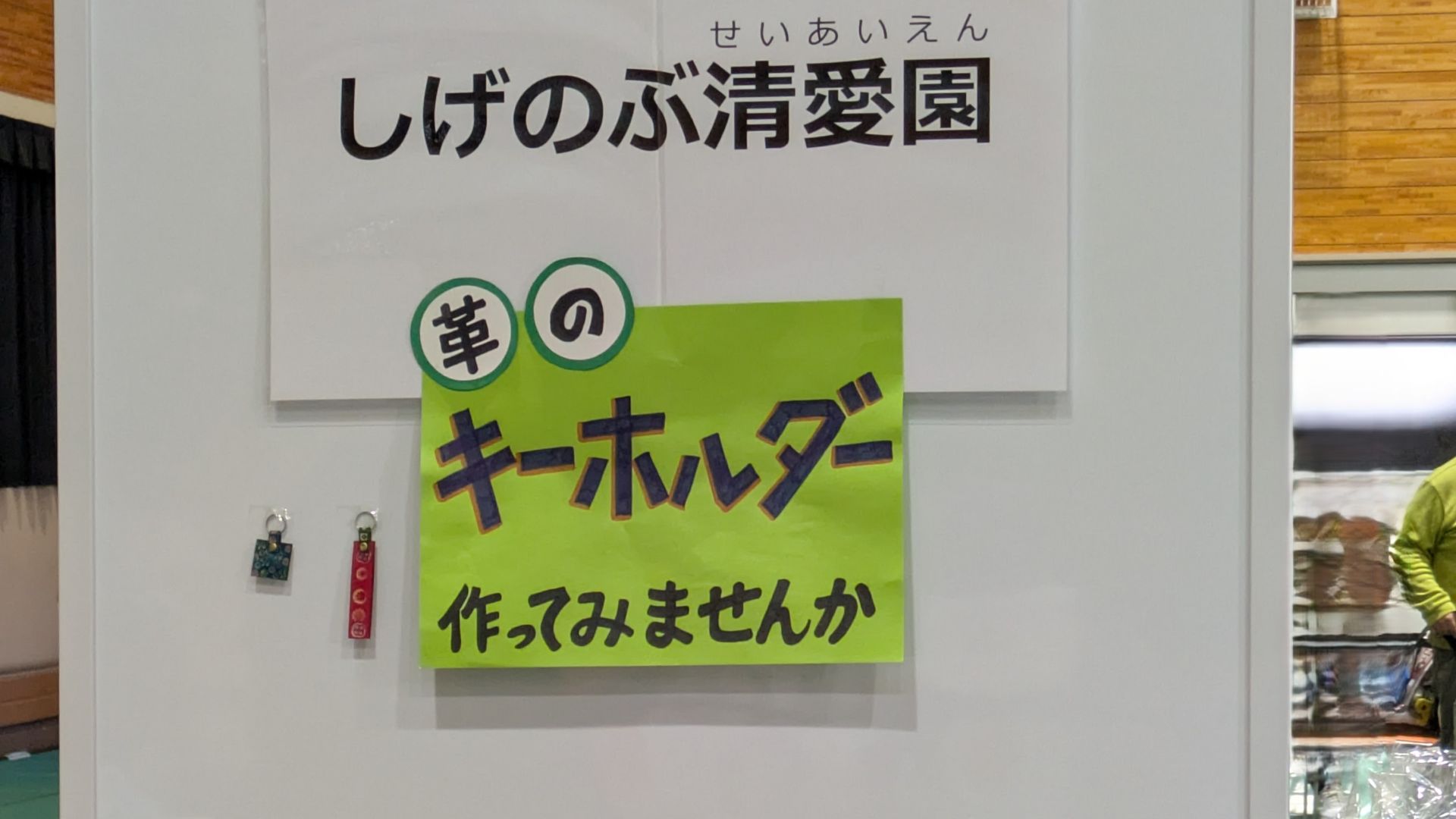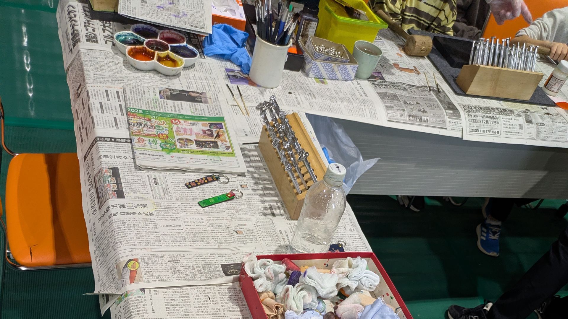 活動内容は、お客様のキーホルダー作りのサポートです。お客様にキーホルダーにしたい革を選んでもらい、木槌で叩いて花や動物など色々な形をスタンプして貰いました。その後、色を塗ったり、キーホルダーの留め具となる革やリングを選んでもらったりしてお客様の好みに合うようなキーホルダーを一緒に作りました。