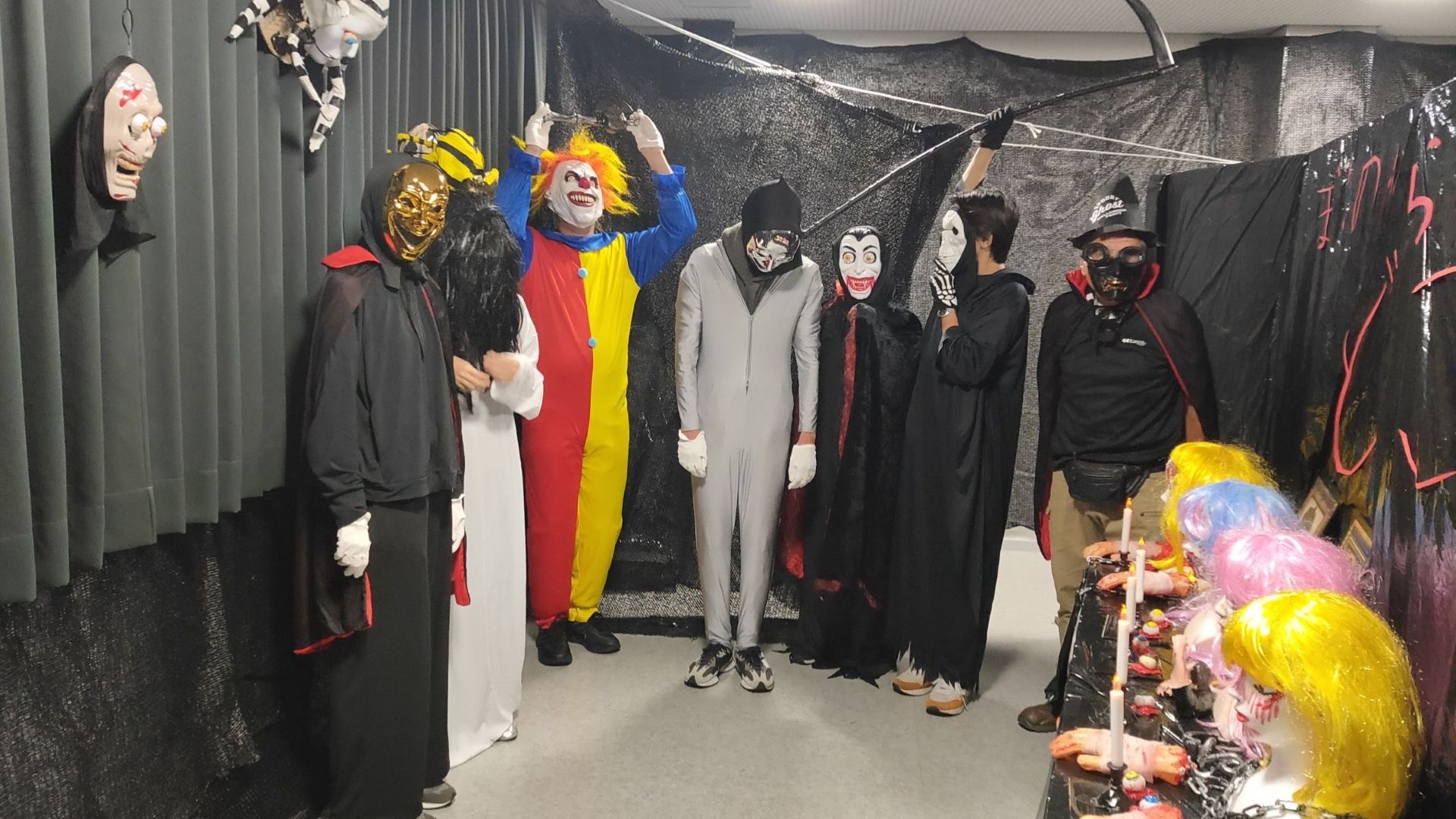 約2週間前からお化け屋敷の飾り付けや物の設置、装飾物の制作などの準備に取り掛かり、公民館の方とどうすればよりよくできるかコミュニケーションをとりながら試行錯誤を重ねました。そして当日は、私たち大学生は全員、ピエロ・死神・貞子などのお化けの格好を身に着けて、お化け屋敷の中でたくさんの小学生たちを驚かせました。驚かす方法を途中で変化させながら最善策を探すのは、大変さを上回る楽しさがありました。個人的に、去年よりも怖がって泣いている子が多い気がして、やりがいのあるお化け屋敷になったと思います。