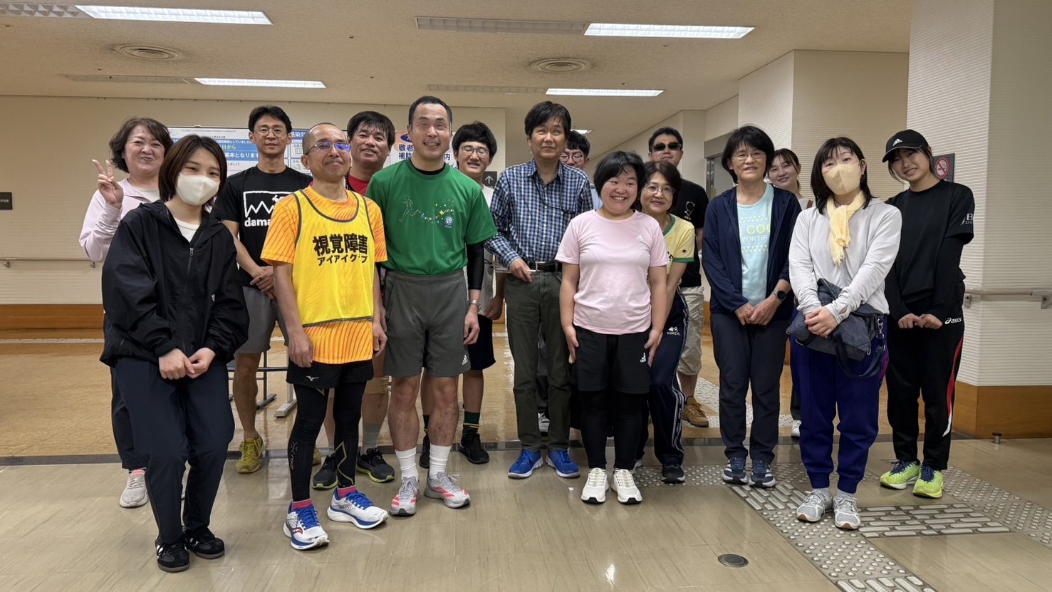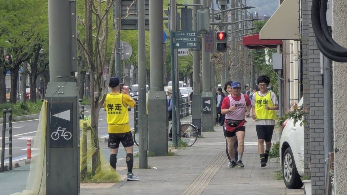 伴走ボランティアとは、目の不自由な方が安心して走れるようにお手伝いするものです。目の不自由な方1名と、伴走者1名以上(人数は変わることもあります)でチームを組み、各々のペースで走ります。状況や人によっては歩くこともあります。