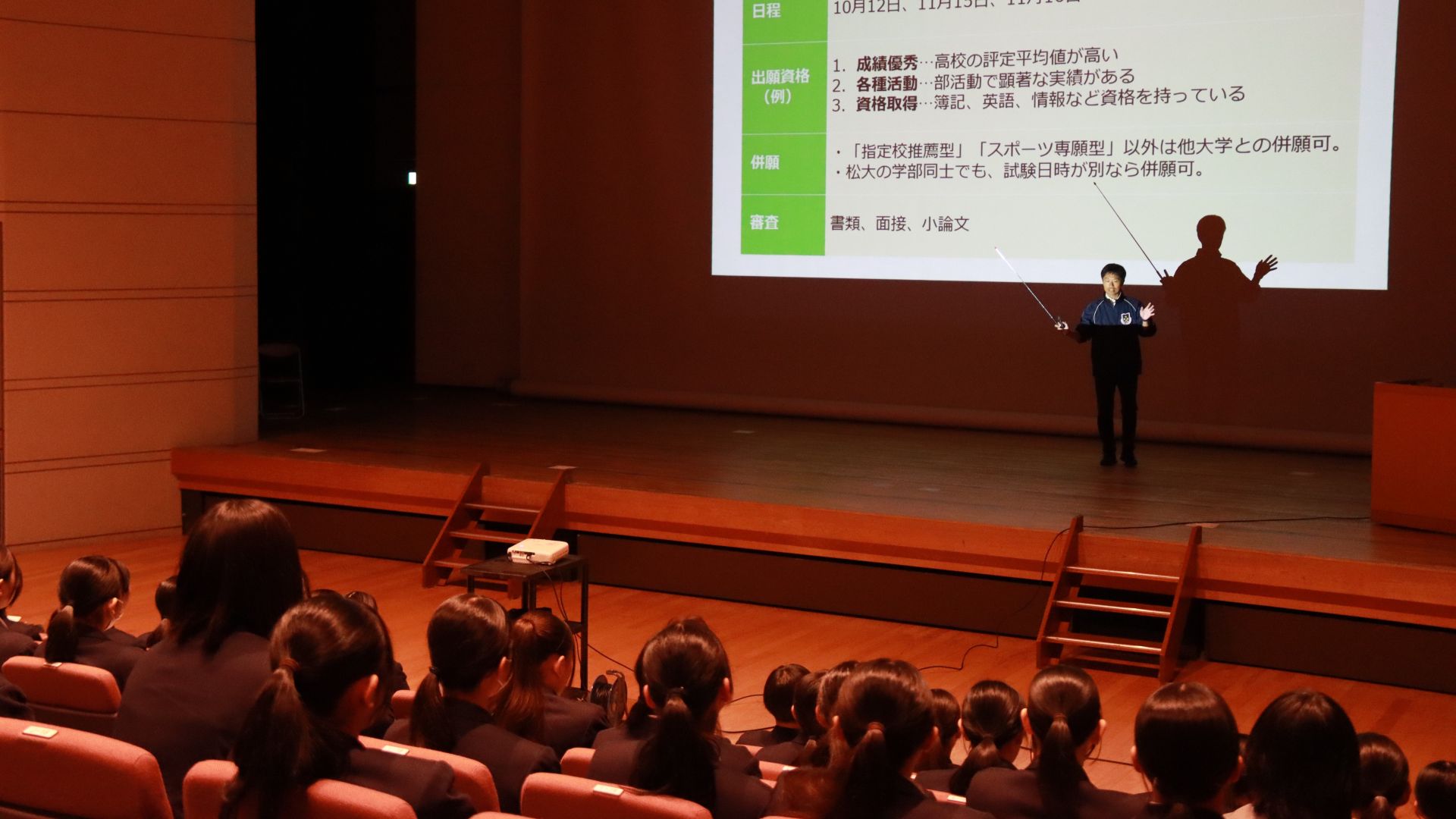 これは本学が提供している高大連携プログラムの一つとして、高等学校からの要望に応じて大学見学を受け入れるものであり、「オーダーメイドオープンキャンパス」と称して、松山大学の雰囲気をより深く実感してもらおうという企画です。
