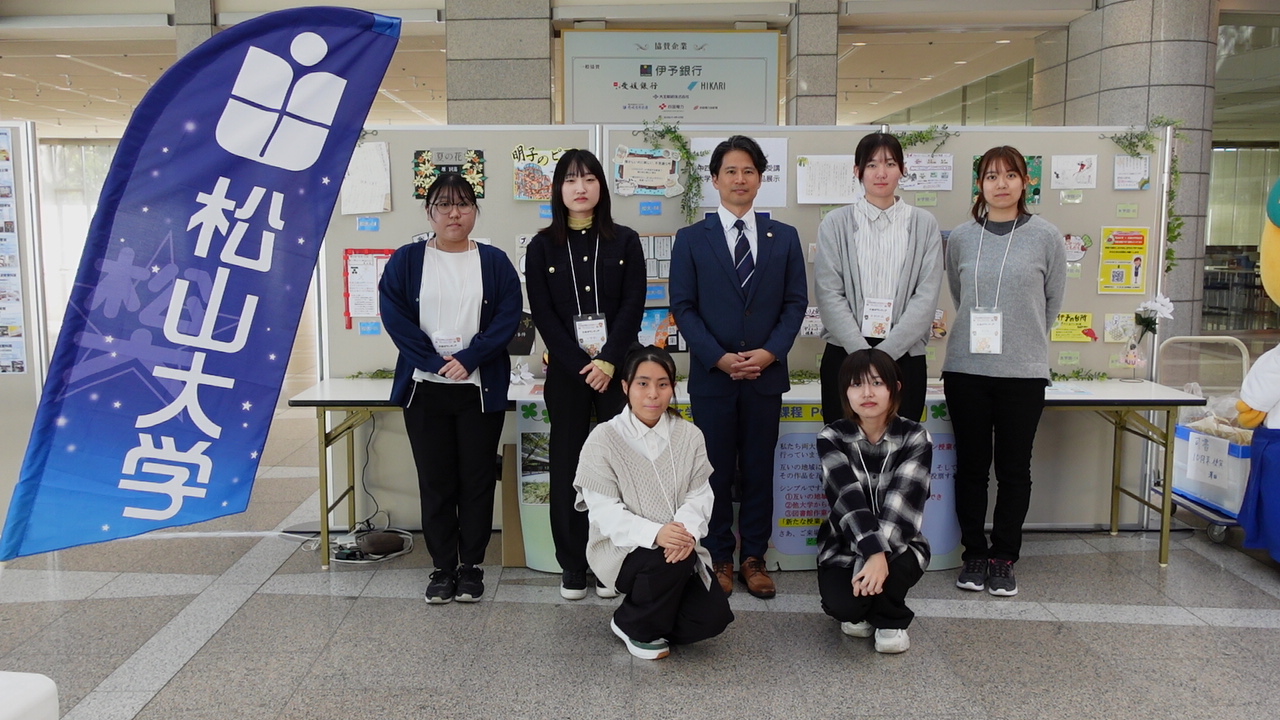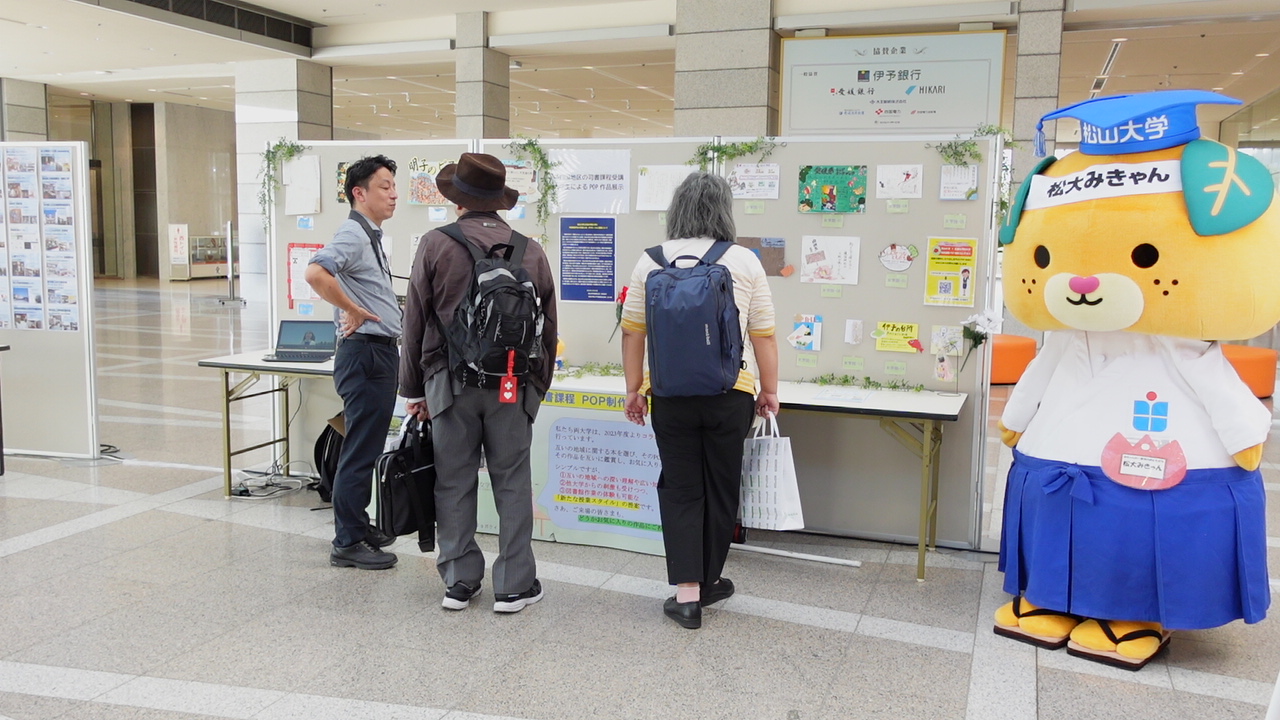 大会第1日目、県民文化会館メインホール前の県民文化プラザに設置された展示ブースの一角で、松山大学の学生展示を開催しました。