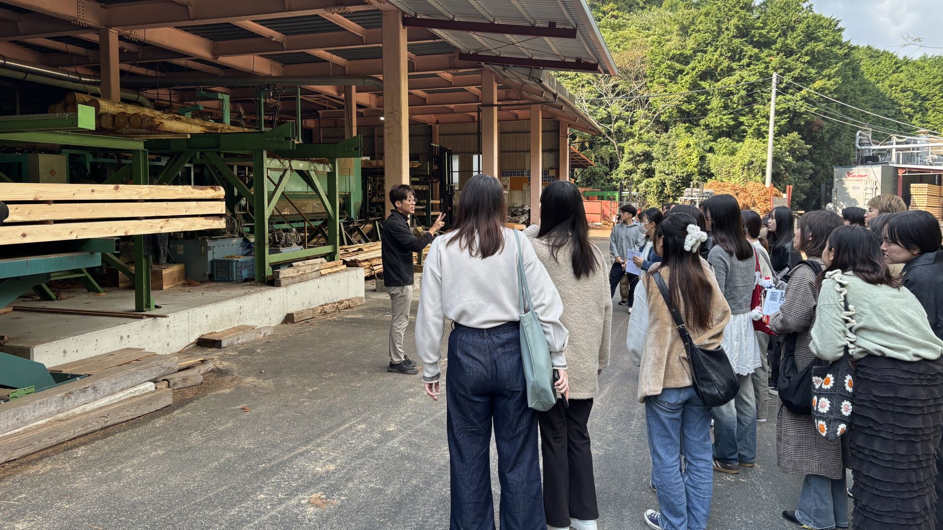 フィールドワークに参加した大野木慈音さん(人文社会2生)は、「実際に木が材木に加工され、乾燥する工程を見学し、工場の機械化によって女性でも働けるような環境に代わっていることに驚きました。また、自然乾燥材は完全に乾かすのに1年以上もかかるという話を聞き、自分たちが住んでいる家に使われている木材もたくさんの手間暇がかかっていることを実感しました。さらに、材木の切り出しと同時に林の管理もしているという話を聞いて、自然と共生する中でも重要な役割を担っていることを感じました」と語ってくれました。