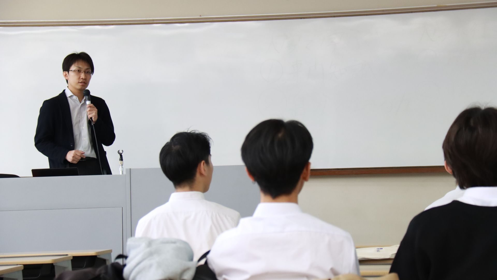 最後に、経済学部経済学科尾沼広基准教授による「環境問題の原因と解決策について経済学で考えてみよう」と題した模擬授業が行われ、参加した生徒は熱心に聞き入っていました。