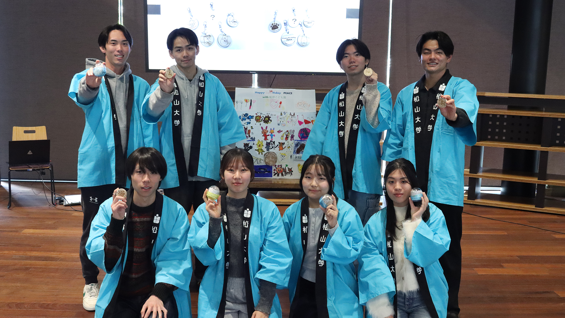 松山大学では、本学の学生・教員が地域産業・企業と連携し、地域ならびに地域産業の活性化を推進する社会人基礎力育成事業を行っています。その中の一つである「ZooProject」は2021年度より愛媛県立とべ動物園(公益財団法人愛媛県動物園協会)と連携し動物園の魅力発信、活性化を目指す活動を行っています。「癒しの空間としてのとべ動物園」に着目し、地域の活性化を目指して今年度8作品目となる商品を企画、12月6日(土曜日)に行われるしろくまピースの26歳の誕生日会に合わせて販売することとなり、12月3日(水曜日)に樋又キャンパスのアカデミック・ソーシャル・コモンズにてお披露目式を開催しました。