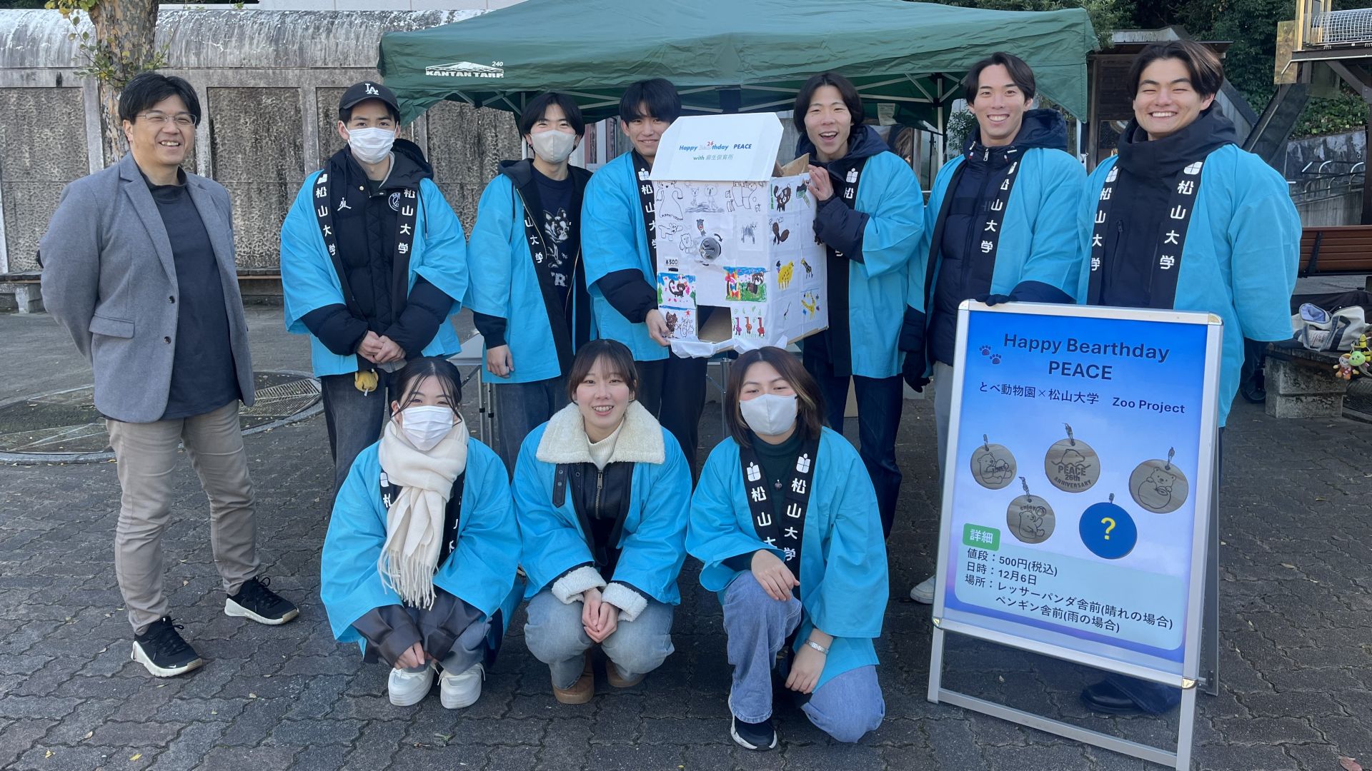 とべ動物園の人気者「ピース」をモチーフにした木製キーホルダーは、学生が動物園職員やいだい清風園職員と何度も話し合いを重ね、意見を出し合いながら「動物を身近に感じてほしい、木目のもつやさしい色合いや手ざわりを感じてほしい」との思いをこめて制作されました。シークレット商品を含めた5つのデザインを用意し、ピースの成長を祝う気持ちを込め「Happy Bear(ベアー)thday PEACE」をテーマに、ピース26歳の誕生日会当日、同園にて販売しました。また、購入する際にもお客様に楽しんでもらおうと、砥部町内の園児たちが描いたさまざまな動物の絵を貼った段ボール製のガチャマシンも手作りしました。販売会では、学生たちが積極的に来園者へ声をかけ、お客様と笑顔でふれ合う様子が見られました。イベントは大変好評で、限定250個が2時間ほどの早さで完売しました。その後、14時00分から行われたピースのお誕生日会にもバースデーソングを歌唱する役割をいただき、積極的に活動に取り組むことができました。