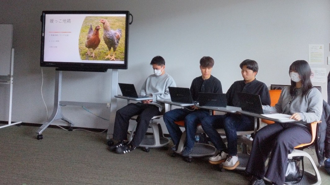 2025年12月10日(水曜日)、樋又キャンパスにて学生と教職員を対象に報告会が行われ、同時にその様子はYouTubeでLIVE配信も行われました。この調査は、経営学部の上杉志朗教授と経営学部の学生14名によって実施され、愛媛県が開発したブランド地鶏『媛っこ地鶏』を題材に、地域ブランドの価値向上や、観光客・関係人口の創出に向けた戦略について調査・分析を行いました。現地でのフィールドワークや消費者アンケート、関係者へのヒアリングなどを通じて、地域資源の活用と地域経済活性化の可能性について多角的に検討しました。