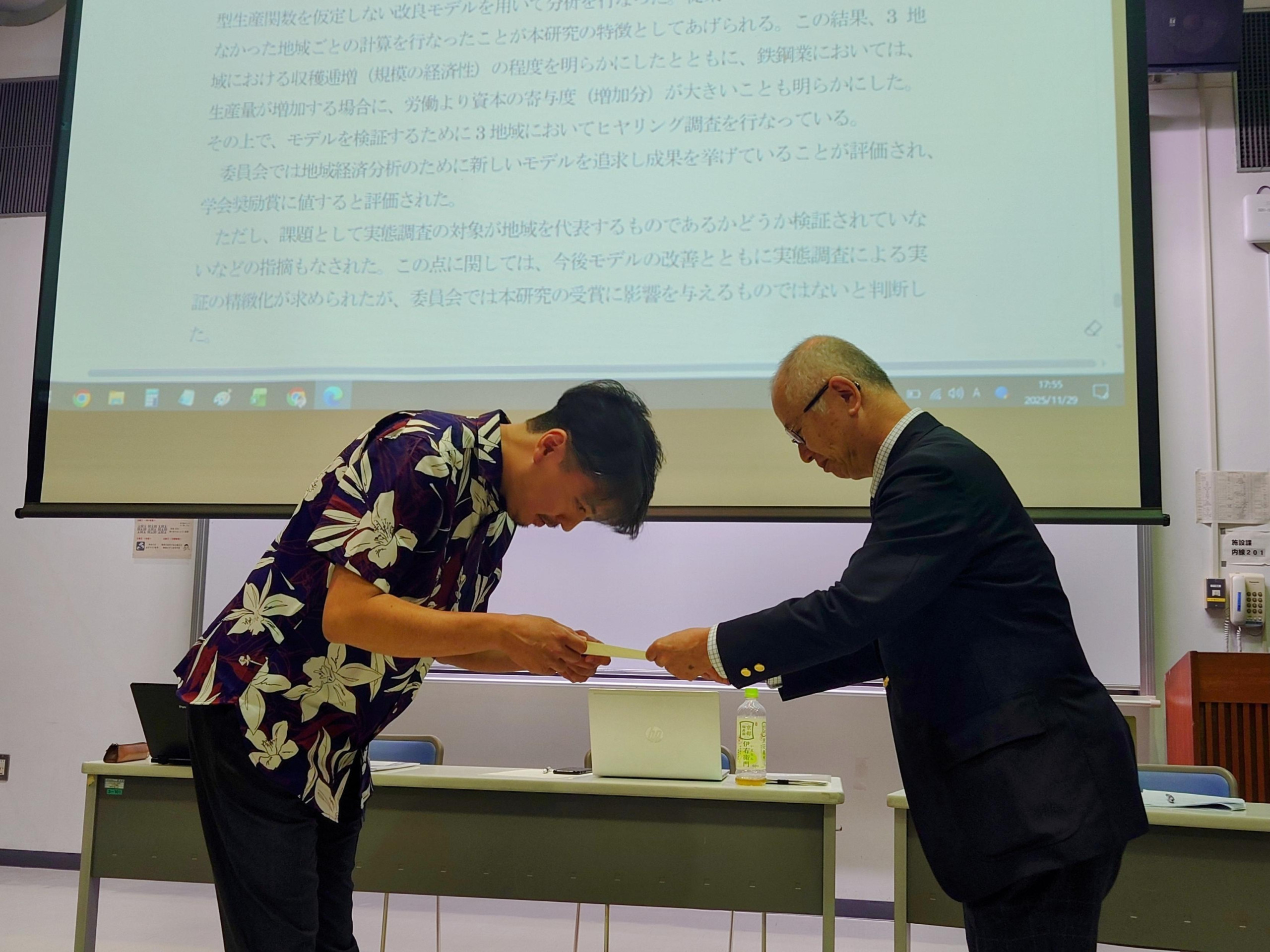 井草 剛教授(筆頭著者)の論文「地域産業比較分析に関する計量経済モデルの開発――地域鉄鋼業(浦安市、名古屋市、松山市)の比較を通して――」が、日本地域経済学会「奨励賞(論文の部)」を受賞し、2025年11月29日(土曜日)の授賞式で表彰されました。地域産業を比較する計量モデルを整備し、鉄鋼業の規模の経済性と生産の質を同一枠組みで定量化。浦安市・名古屋市で収穫逓増、松山市で収穫一定を示すとともに、企業11社への聞き取りで解釈を補完しました。