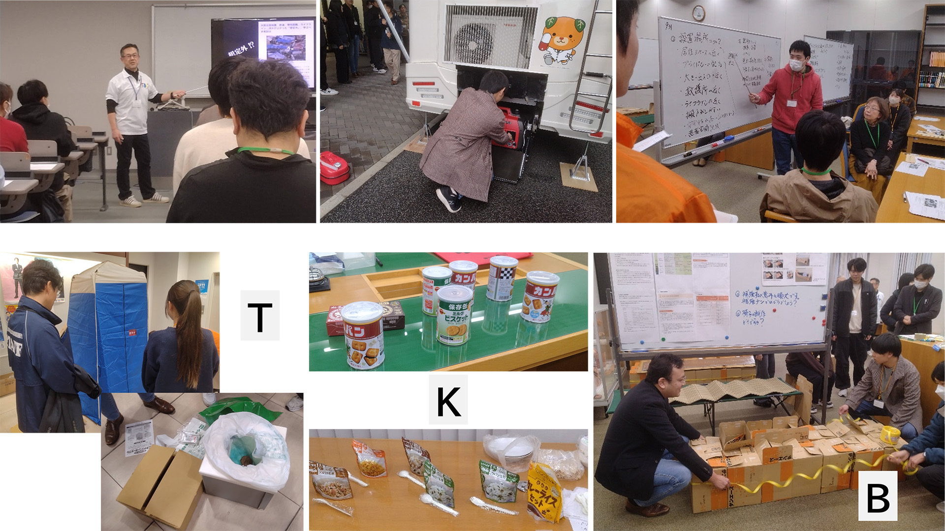 T(トイレ)では簡易トイレを組み立て、実際の使用を想定しながら、使用後の処理方法や衛生面での注意点を確認しました。