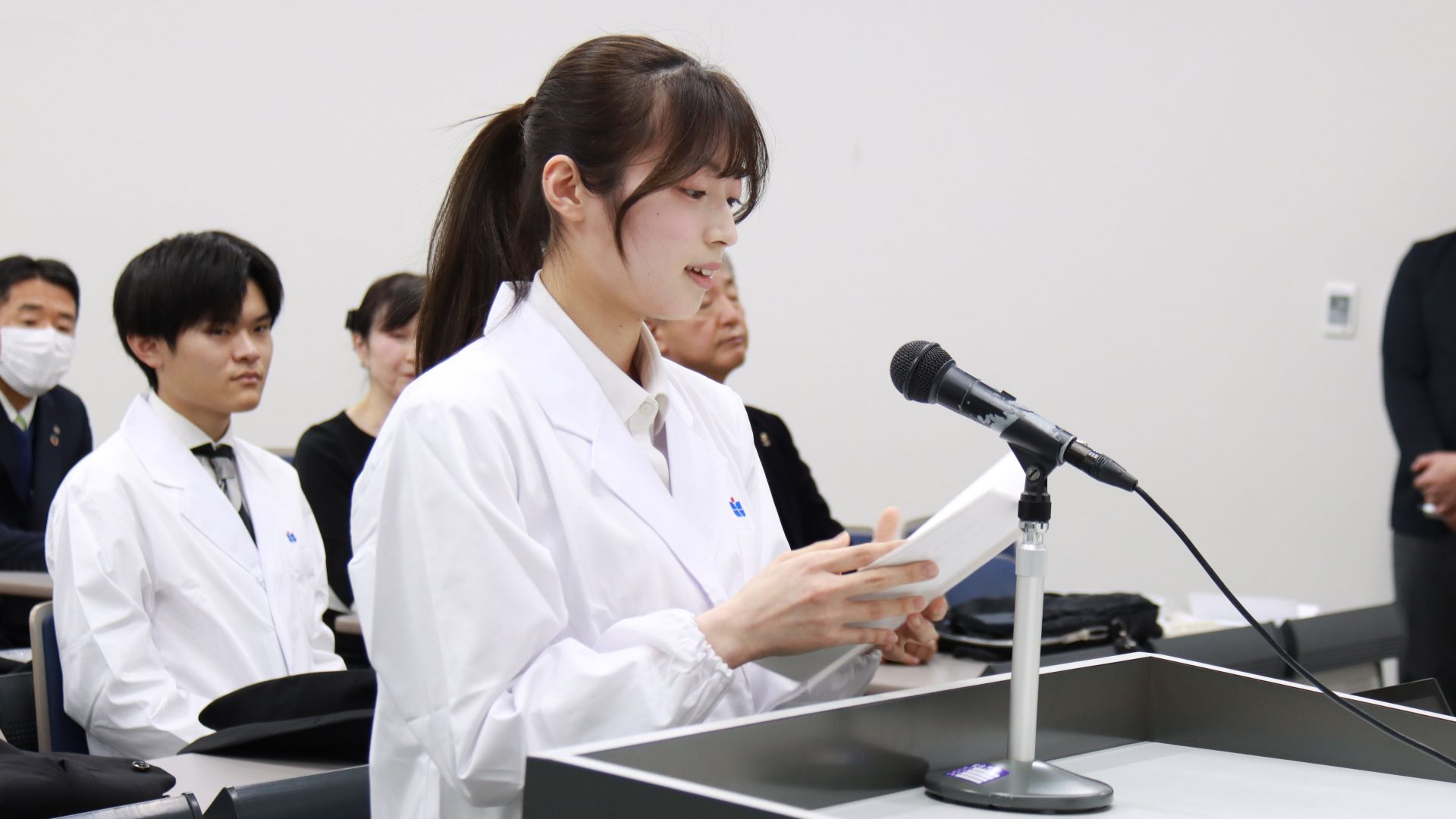 学生代表挨拶では、4年次生の佐々木愛未さんが「私たち松山大学薬学部4年次生は、入学以来多くのことを学び、薬学共用試験に合格し、まもなく実務実習に臨みます。これから始まる病院・薬局実務実習では、現場の先生方を模範とし、薬剤師となるための第一歩を踏み出したいと考えています」と力強く決意を述べました。