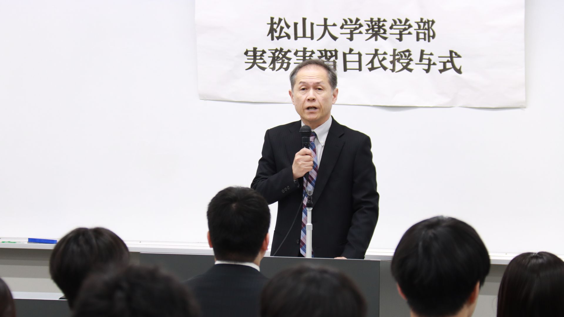 式の冒頭では、天倉吉章 薬学部長が「白衣授与式を迎えられましたことを心よりお祝い申し上げます。袖を通す白衣は、松山大学のロゴが入った特別なものです。自覚をもって真摯に実務実習に取り組んでください」と祝辞を述べました。