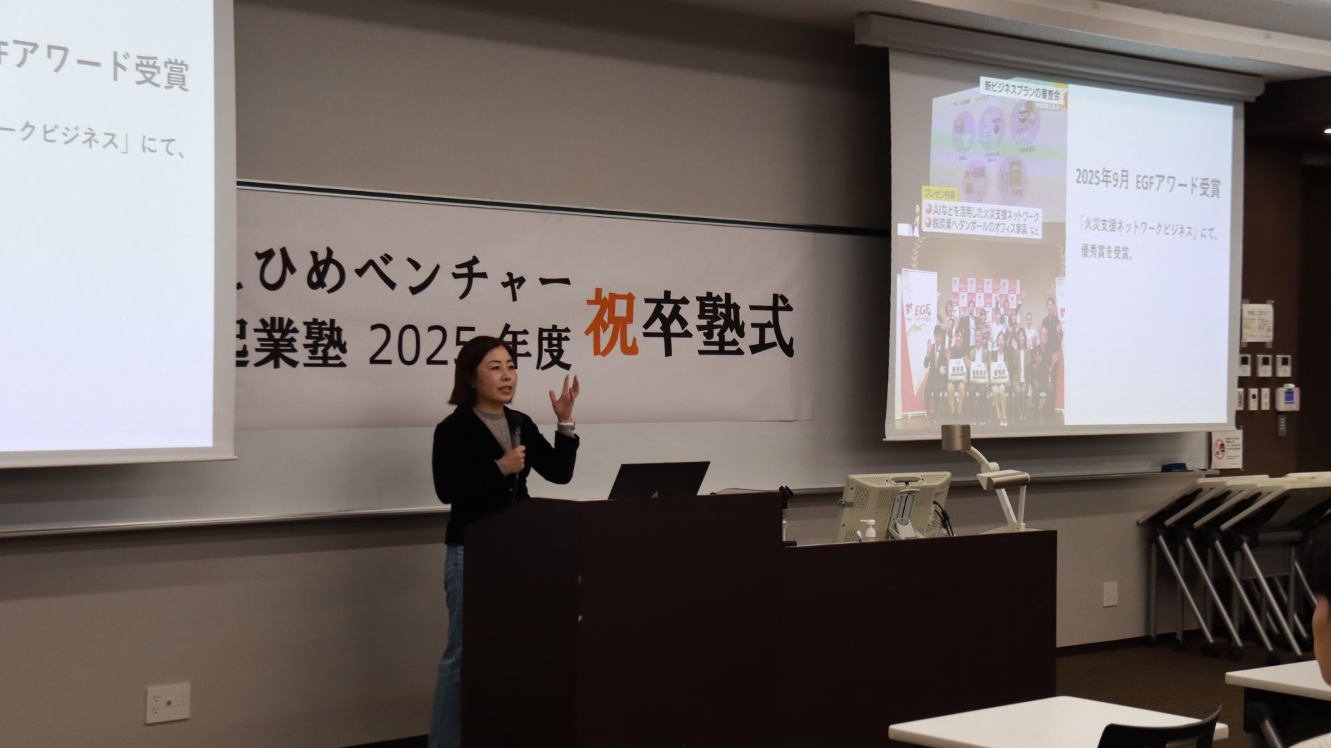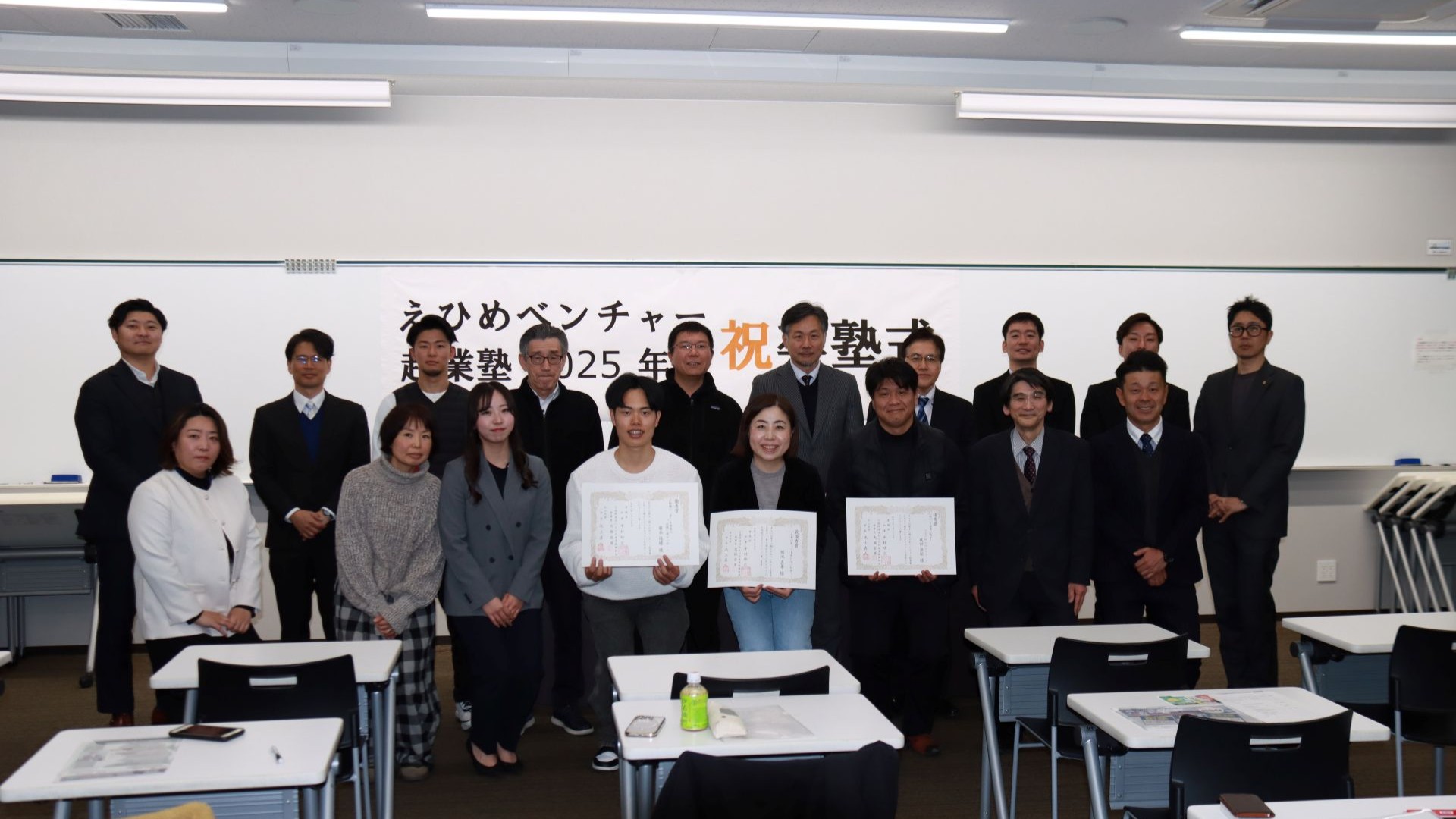 愛媛県、公益財団法人えひめ産業振興財団及び学校法人松山大学の共催による官学プロジェクト「えひめベンチャー起業塾」(第12期・全14回)は、全てのカリキュラムが終了し、2026年1月29日(木曜日)18時30分より本学樋又キャンパスにて、優秀な事業計画を発表した受講生の表彰式及び卒塾式が行われました。