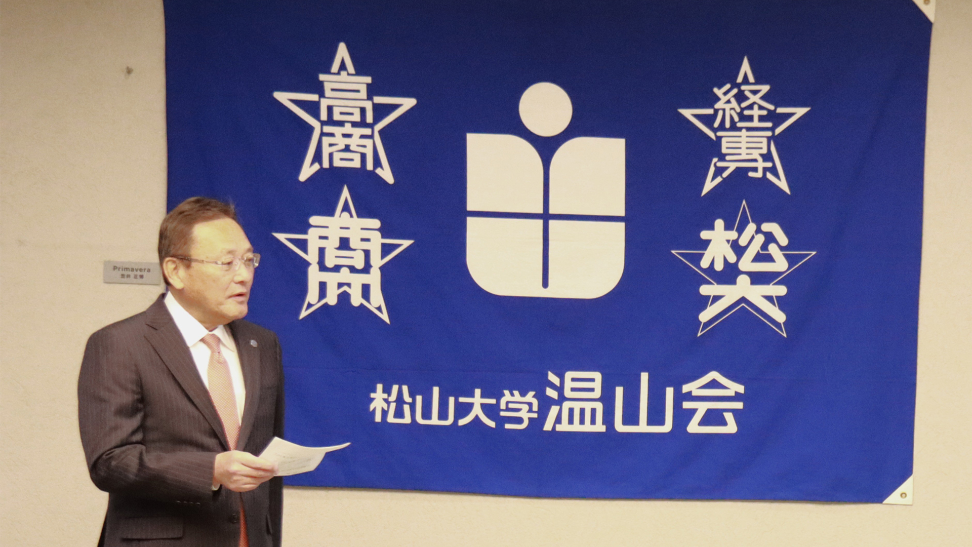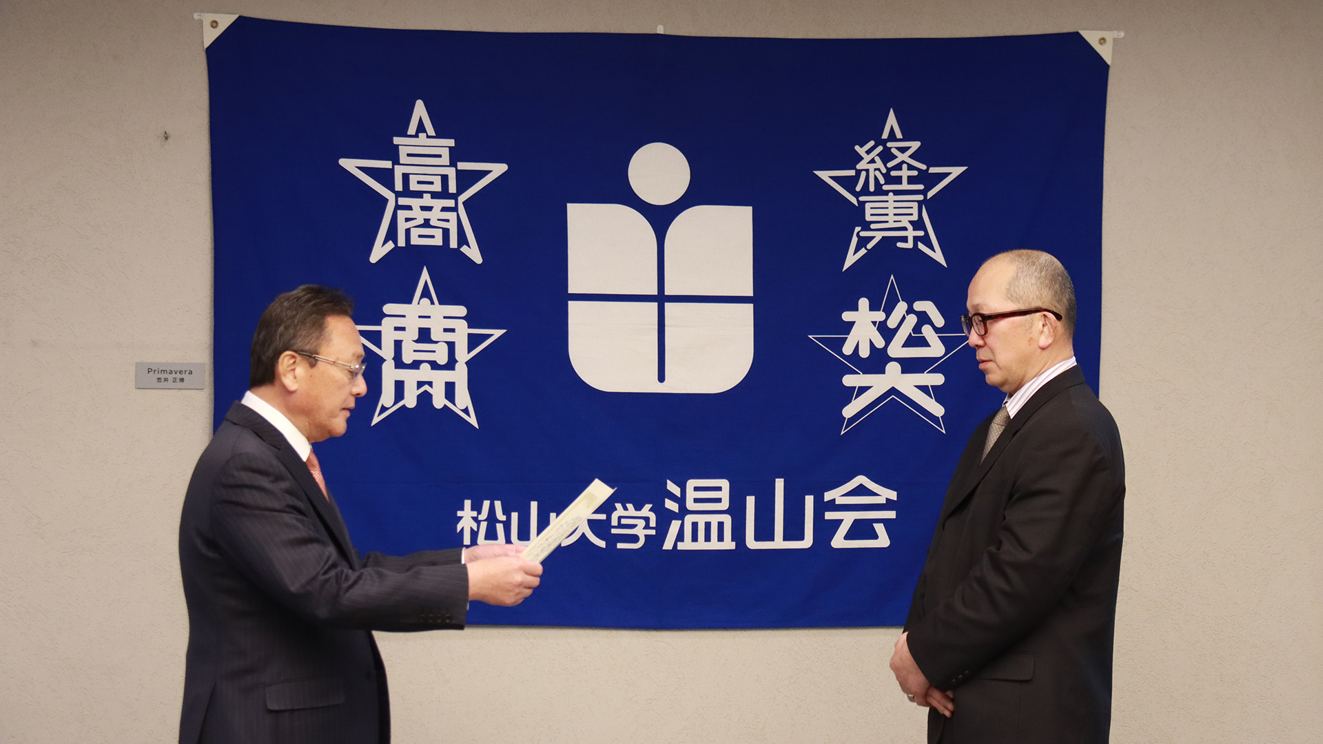 表彰式では、温山会の山口普会長から表彰状が、また、松山大学父母の会の八塚会長、松山大学文京会の西川会長から御祝金が贈呈され、会場に集まった関係者からも祝福の拍手が送られました。