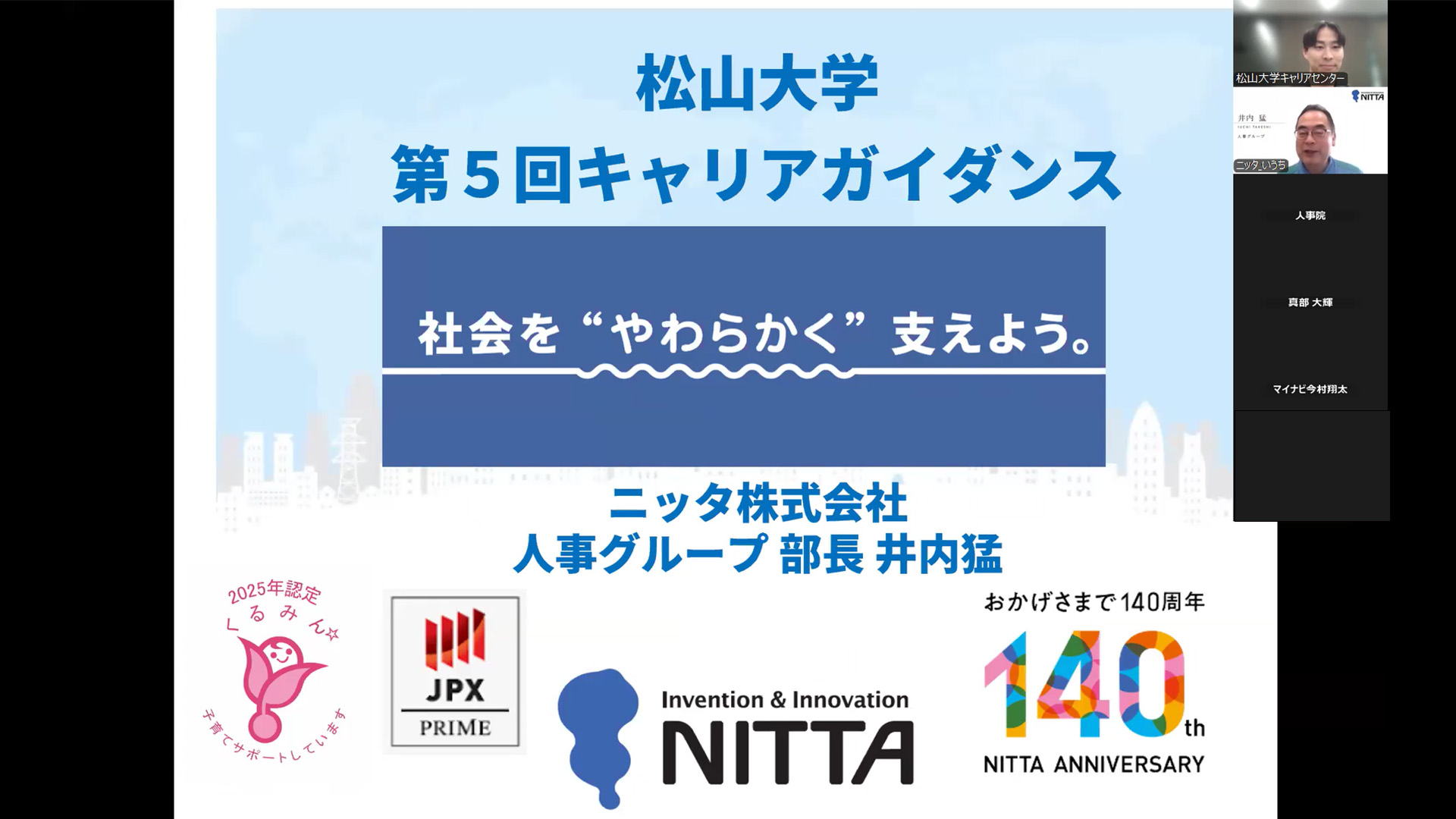 ガイダンスでは、株式会社マイナビ 今村 翔太氏を講師に、人事院・ニッタ株式会社・日本興業株式会社の人事担当者をゲストにお招きし、「企業が求めている人物像」や「AI時代のキャリア」など、様々なテーマでトークセッションが行われました。