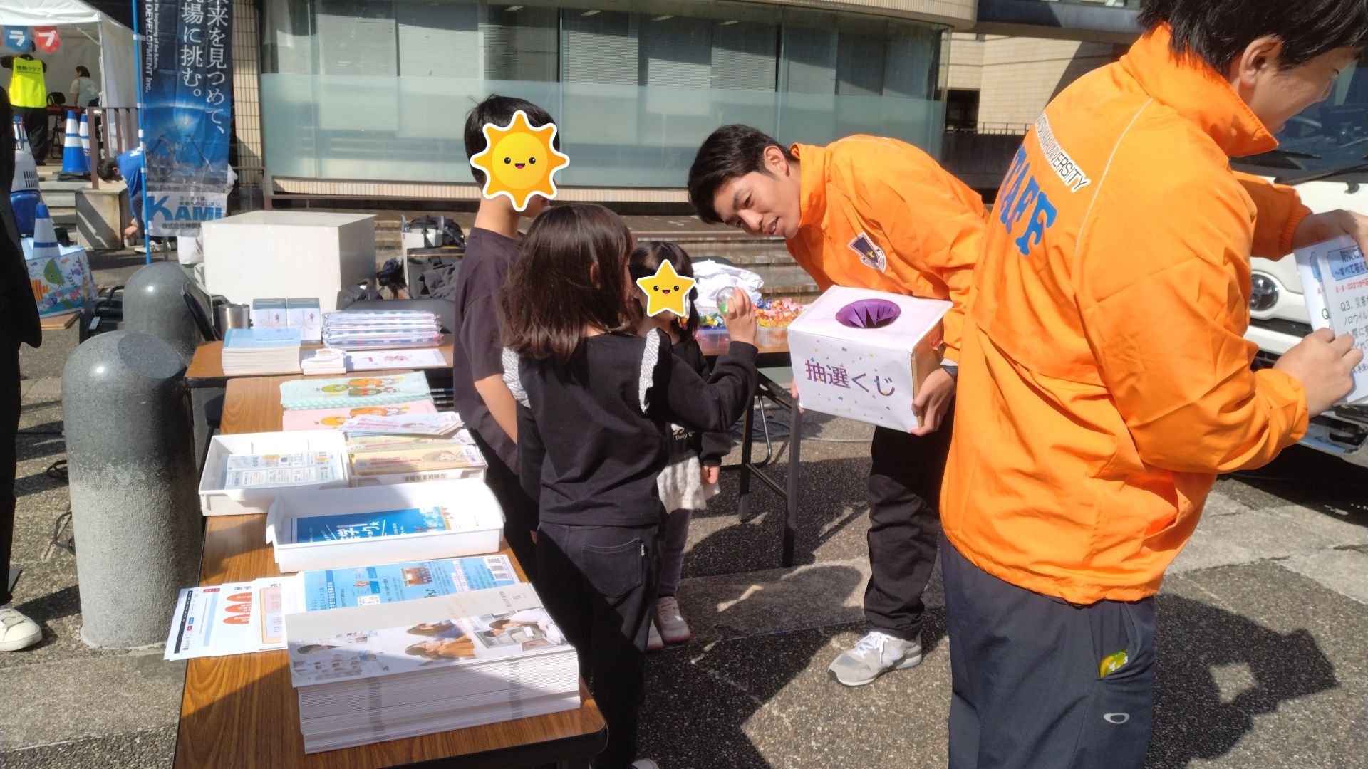 体験後は、動く薬局前に展示された本学マスコットの松大みきゃん(白衣バージョン)の前で記念撮影。大人から子供まで貸し出しの白衣を身にまとい、写真スポットでの撮影を楽しむ様子が印象的でした。また、来場者には、災害時の食や薬にまつわる簡単なクイズにもチャレンジしてもらいました。参加者からは、子供たちを中心に「少し難しかったけれど面白かった」「勉強になった」などの感想が口々に聞こえてきて、遊びの中からも災害時に事前に知っておくと役立つことについて知識を深めていただけたのではないかと思います。