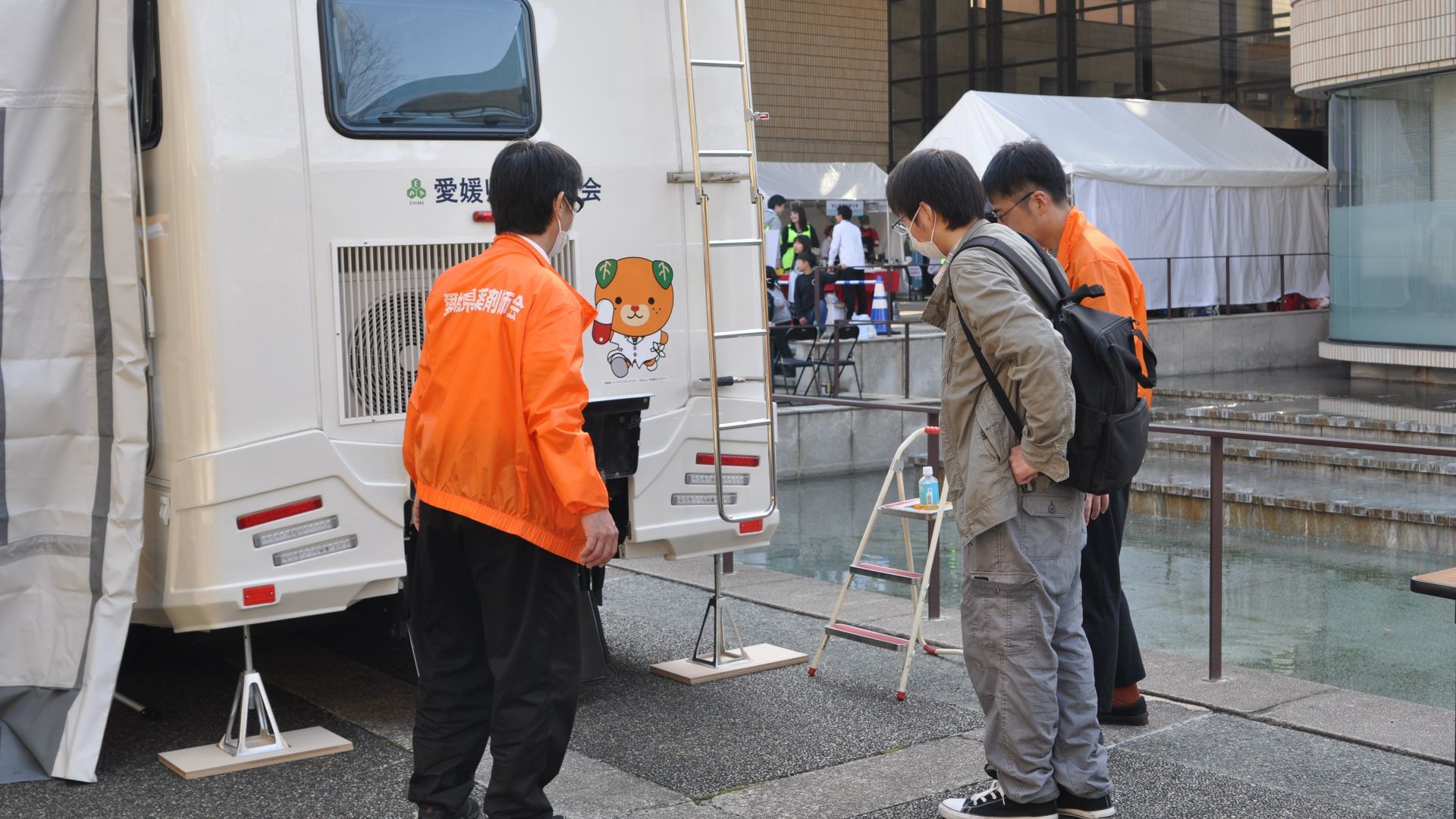 実際に災害が起きた際に被災地で薬剤師が行う支援活動の1つに「医薬品管理・供給」がありますが、その活動を行うための拠点として大活躍するのが、「モバイルファーマシー」(通称、「動く薬局」)です。当日は、屋外広場に展示されたモバイルファーマシーの内部の様子や搭載されている装備等について実際に見てもらうことで、「動く薬局」を体験してもらいました。