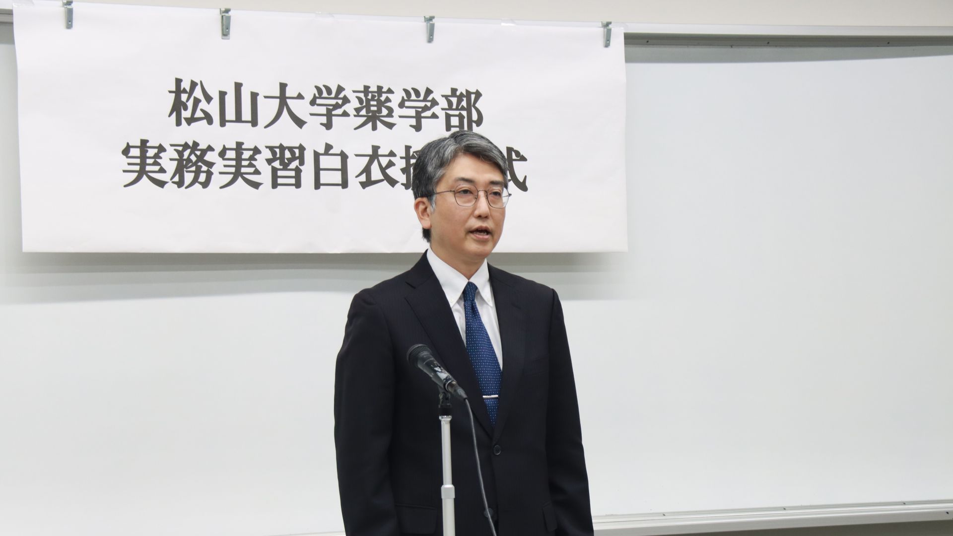 式の冒頭に、舟橋達也薬学部長より「白衣授与式を迎えられましたことを、心よりお祝い申し上げます。袖を通す白衣は、松山大学のロゴが入った特別なものです。自覚をもって真摯に実習に取り組むよう励んでください」と挨拶がありました。続いて来賓の愛媛県病院薬剤師会田中守会長、愛媛県薬剤師会田中智美副会長、松山大学父母の会上田新会長からも学生に向けて温かい激励の言葉が贈られました。