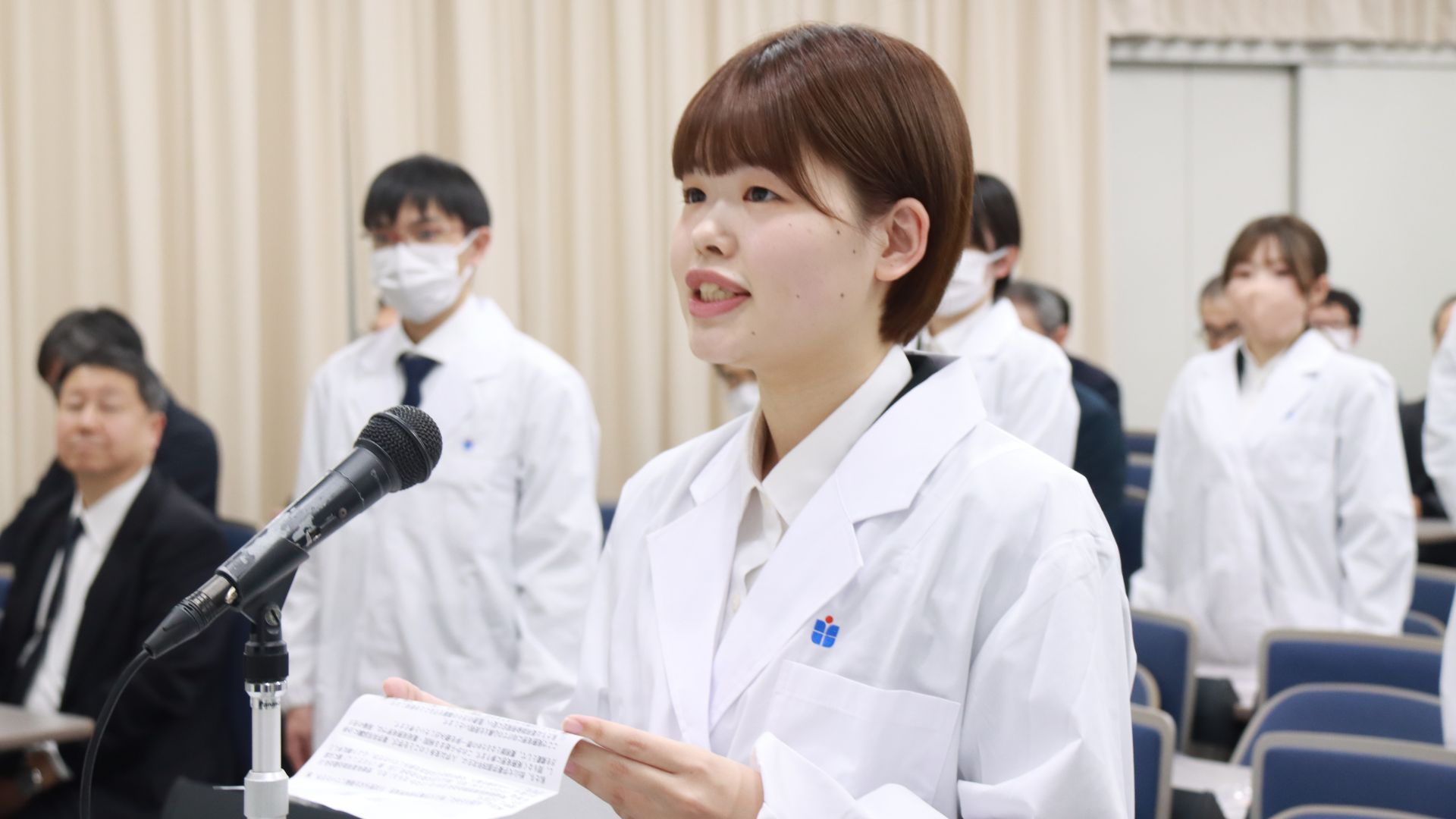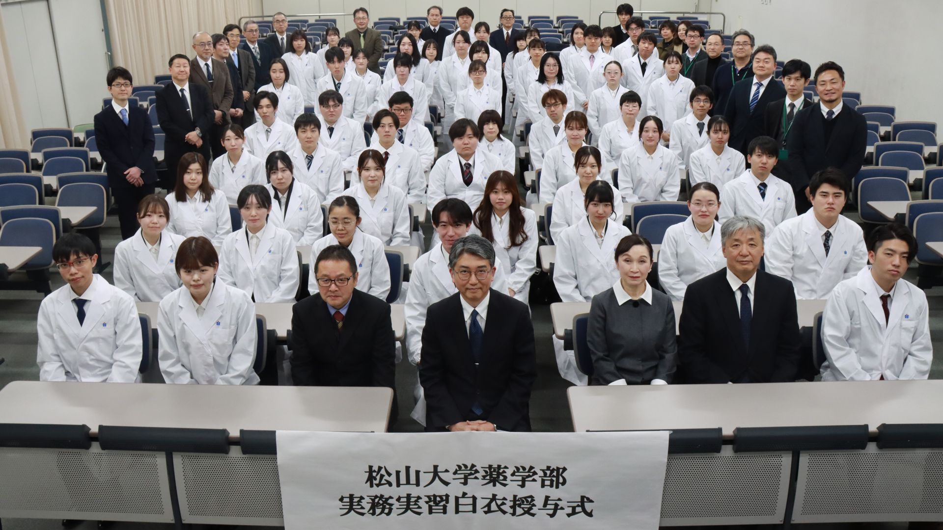 薬学部生からは、4年次生を代表して中川果音さんが「私たち、松山大学薬学部4年次生は、入学以来多くのことを学び、薬学共用試験に合格し、まもなく実務実習に参ります。これから始まる病院・薬局実務実習では、現場の先生方を模範として、薬剤師となるための第一歩を踏み出したいと考えます」と実務実習に向けて力強い決意を表明しました。