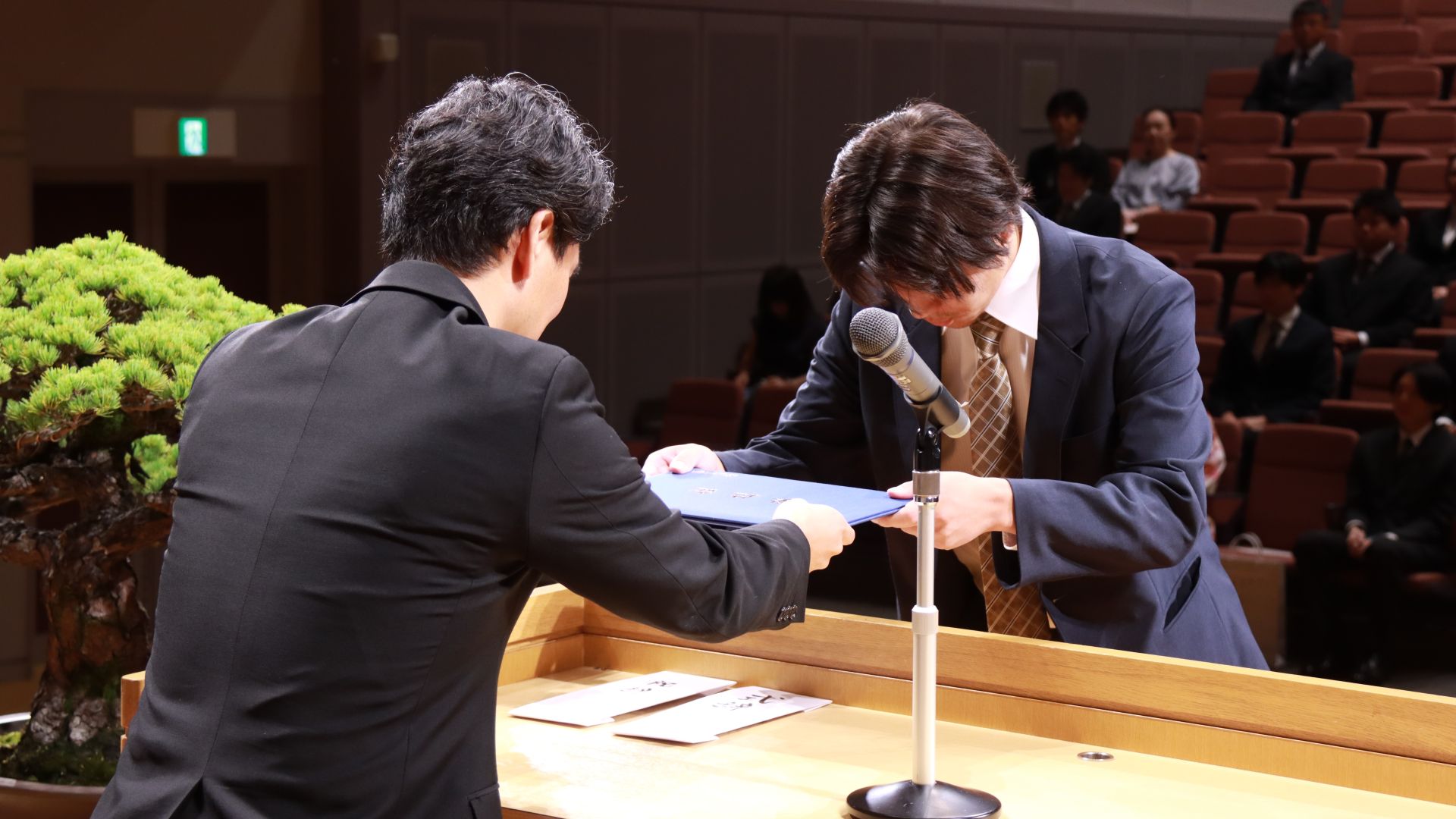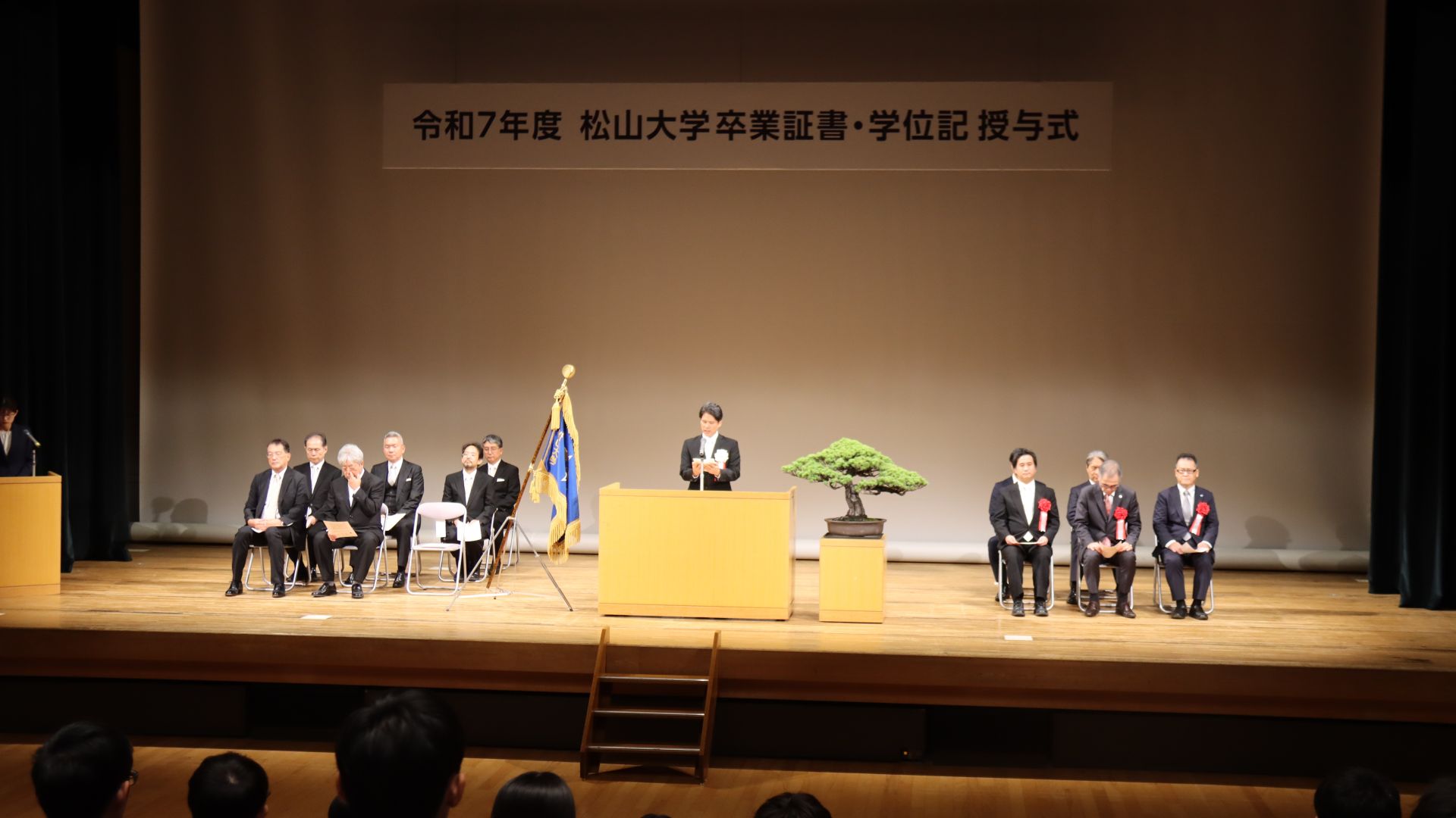 2025年9月30日(火曜日)11時30分から、本学カルフール・ホールにて「令和7年度前期松山大学卒業証書・学位記授与式」が挙行されました。