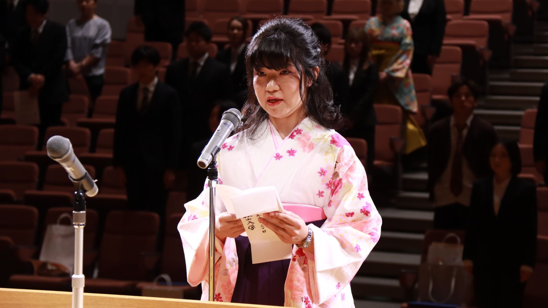 これに対し、薬学部卒業生代表は「数年前、期待と不安を胸に松山大学へ入学し、学業や実習を通じて専門知識と多角的な視点を養いました。実務実習では薬剤師としての責任を実感し、学びを実践に結びつける重要性を理解しました。コロナ禍による制限も経験しながら得た学びを糧に、『真実・実用・忠実』の校訓を胸に、社会で直面する困難を必ず乗り越えてまいります」と決意を新たにしました。