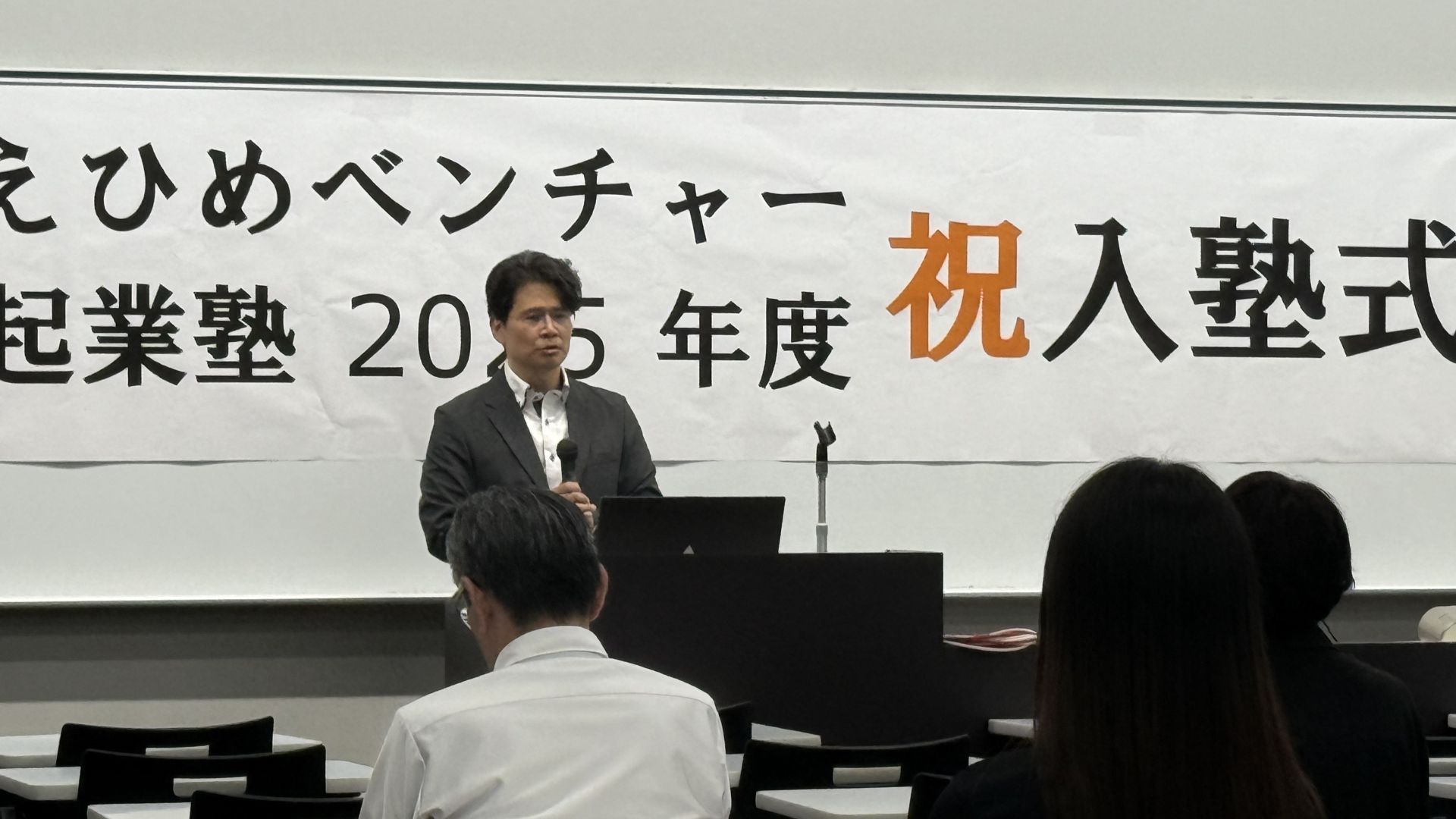 2025年10月2日(木曜日)18時30分から松山大学樋又キャンパスH2A教室にて、「第12期えひめベンチャー起業塾」の入塾式が行われました。えひめベンチャー起業塾は、2014年に愛媛県及び公益財団法人えひめ産業振興財団と創業・ベンチャー支援の促進等に関する連携・協力協定の締結を行い、愛媛県内産業の新陳代謝を促し、地域経済の活性化と地域雇用の創出につなげていくことを目的に「新たな価値を創造し未来を拓く」と題して、起業家を育成する取り組みを行い、これまでに231名の卒塾生を輩出し、18名の方が起業しています。今年度は松山会場15名、オンライン2名、計17名が受講しています。
