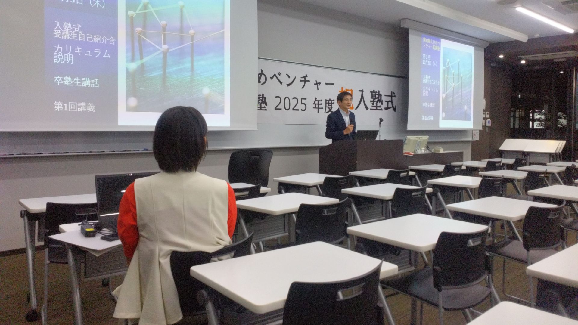 開講に先立ち行われた入塾式では、池上真人学長・社会連携室長より「昨今、アントレプレナーシップ教育や起業支援の重要性が強く打ち出され、大学教育の現場においても大きな注目を集めております。今回受講される皆さまの中には、将来的に起業を志す方もいれば、自らの可能性を広げたいと考えて参加された方もいらっしゃることと思います。この塾で出会う講師陣の講義やアドバイスが、皆さまにとってかけがえのない学びの機会となり、未来を切り拓く力につながりますことを心より願っております」と受講生へ激励の言葉が贈られました。
