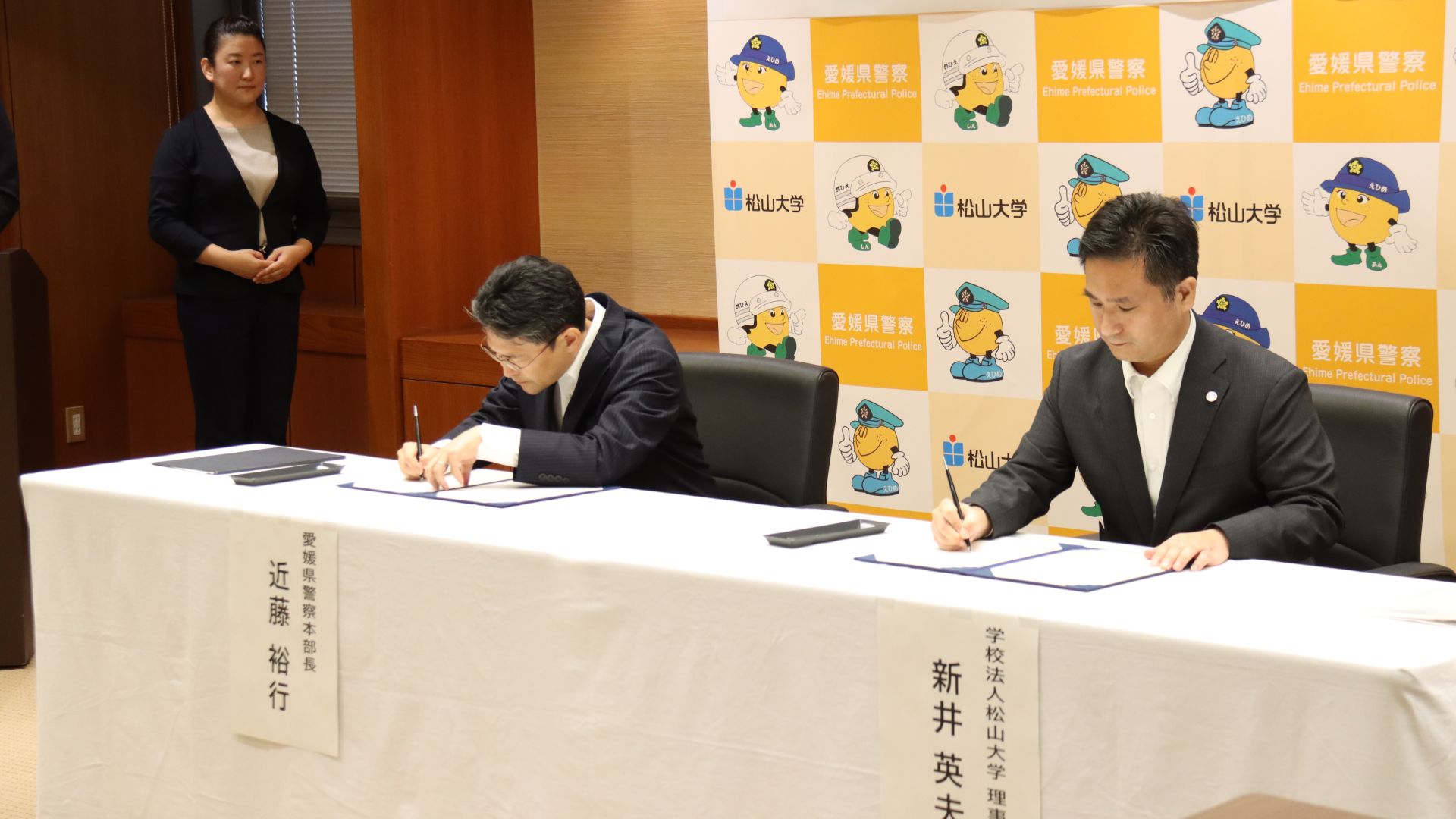 この度の連携協定締結式は、10月20日(月曜日)10時から愛媛県警察本部幹部会議室で行われ、学校法人松山大学の新井英夫理事長と愛媛県警察本部の近藤裕行本部長が出席し、協定書に署名しました。