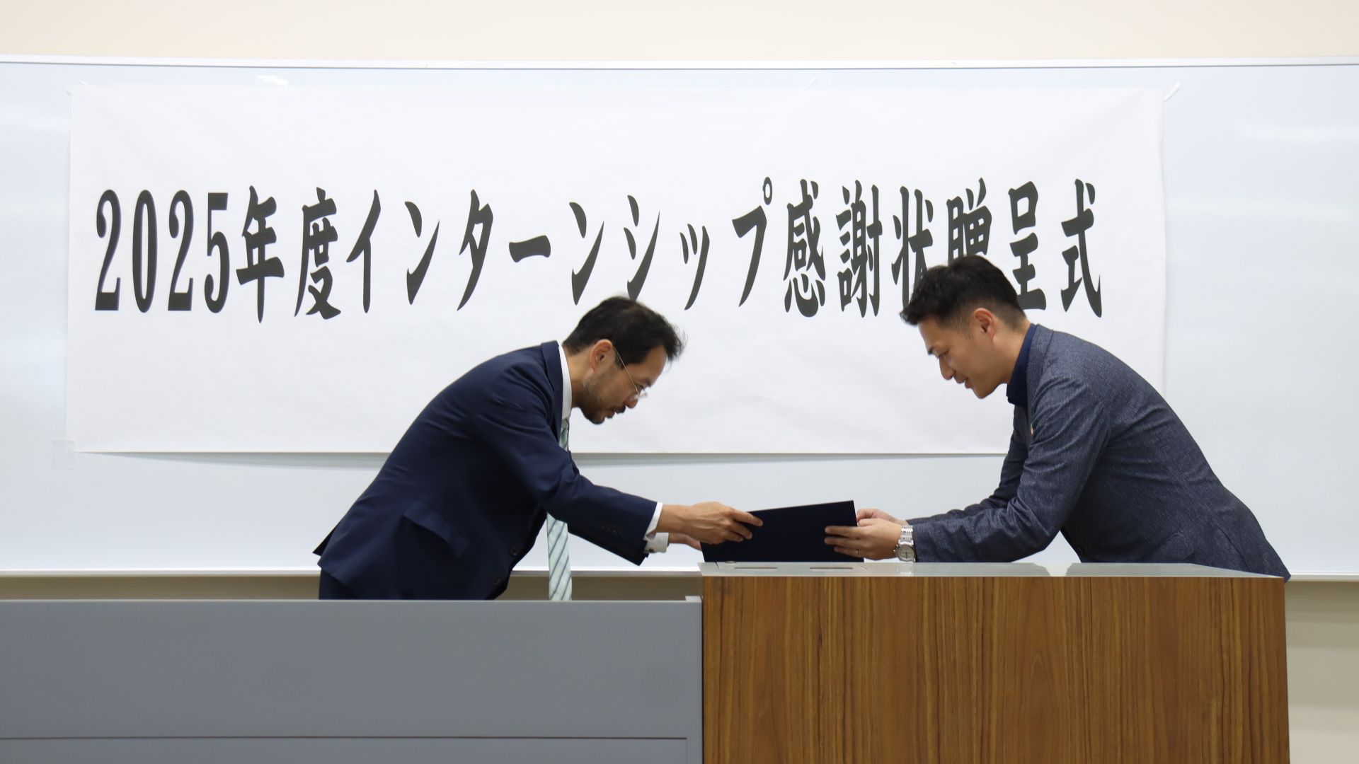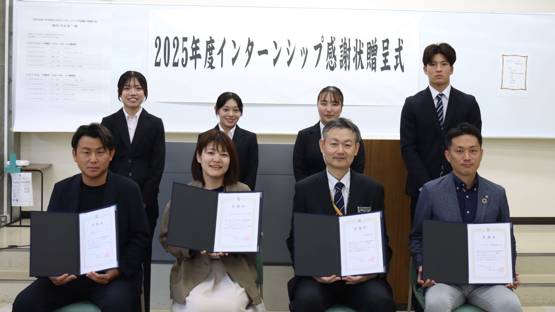 2025年10月21日(火曜日)11時55分より、214番教室にて「令和7年度松山大学インターンシップ感謝状贈呈式」が開催されました。
