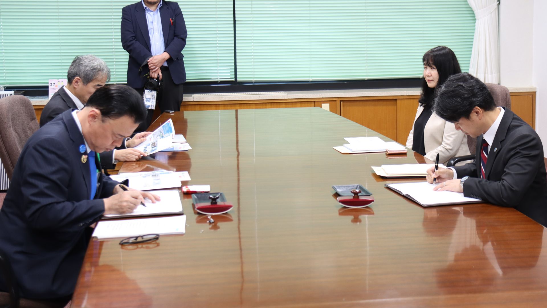2025年10月27日(月曜日)16時00分より、島根県庁において「島根県と松山大学及び松山短期大学との就職支援に関する協定」の締結式が開催され、丸山達也島根県知事と池上真人松山大学学長による協定書への署名・交換が行われました。