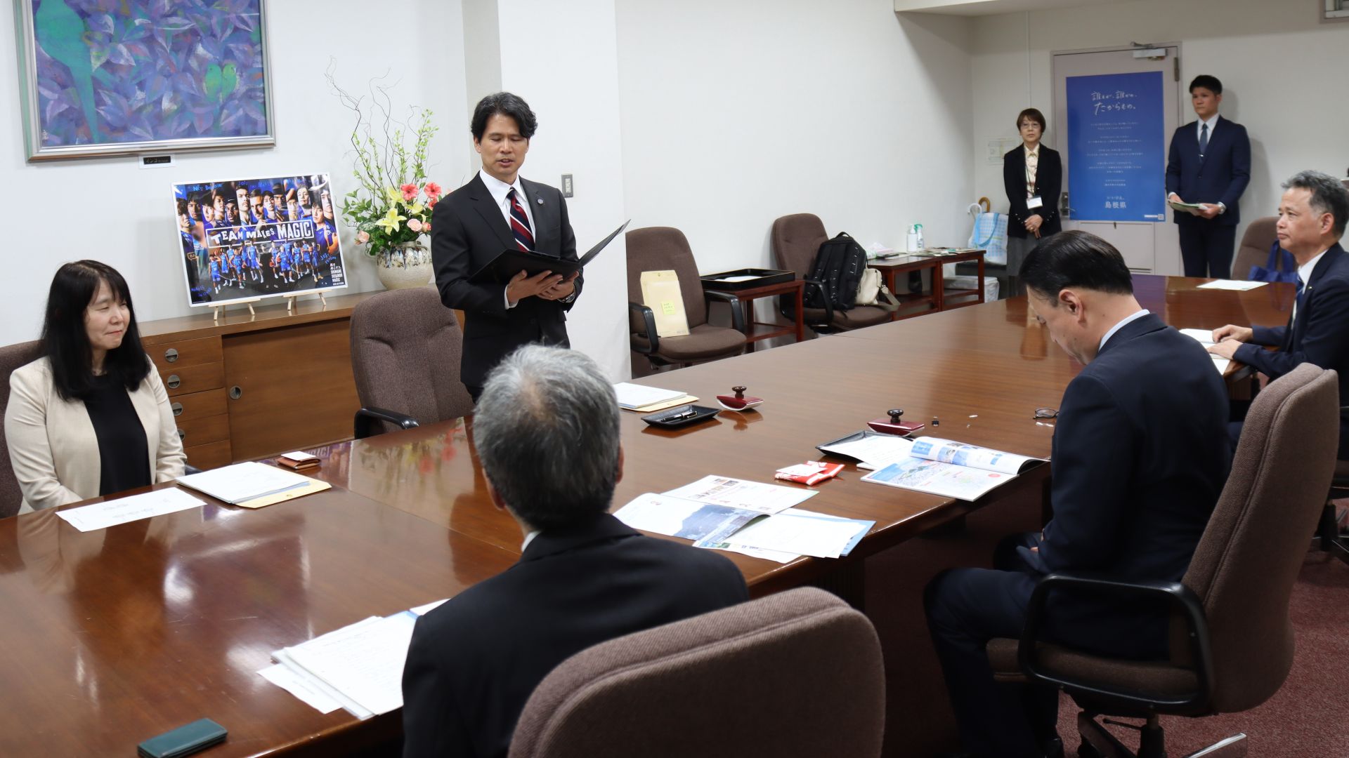締結式では丸山知事より「県内企業やイベントの情報発信を通じて、進学した学生たちに島根県で就職することも一つの選択にしてもらえるようしてもらいたい。そして、松山大学と島根県ともにwin-winの関係を築いていきたい」と挨拶がありました。これを受け、池上学長より「本協定をきっかけに島根県の若い世代が、地域の発展に資する知識と経験を本学で身につけ、本学での学びが島根県の未来の原動力となることを期待したい」と述べました。